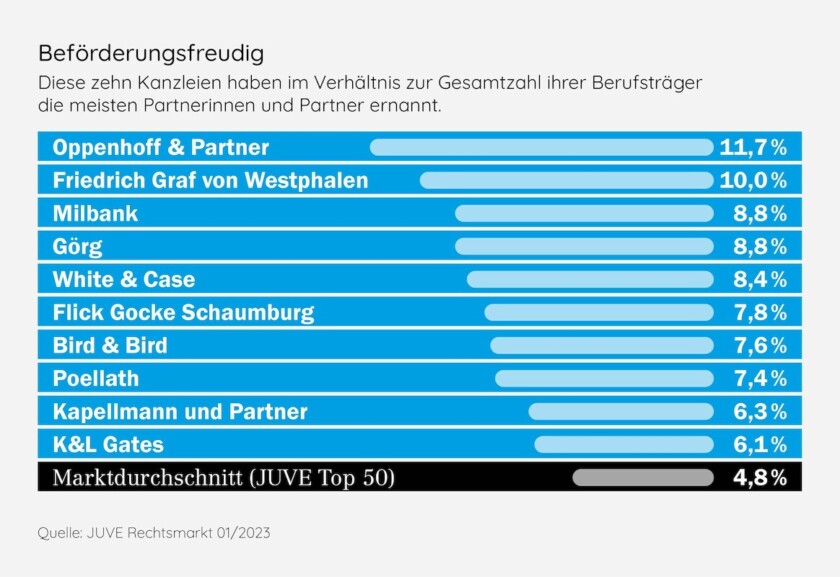 Diese Spitzengruppe ist unterschiedlich zusammengesetzt. Oppenhoff & Partner etwa war bereits in den vergangenen Jahren sehr beförderungsfreudig, insbesondere mit ihrer Zwischenstufe der Junior-Partnerinnen und -Partner. Milbank beispielsweise spiegelt mit fünf Beförderungen nach zwei Nullrunden in den Vorjahren erst jetzt ihren rasanten wirtschaftlichen Aufschwung wider.