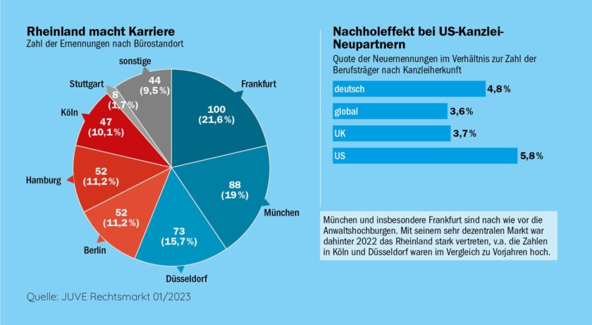 München und Frankfurt sind nach wie vor die Hotspots bei den Partnerernennungen. Doch auch das Rheinland war in 2022 stark vertreten: Gemeinsam kommen Köln und Düsseldorf auf 120 Partner- und Counsel-Ernennungen, das sind fast 26 Prozent der Beförderungen in den JUVE Top 50. Zählt man beide also zusammen, liegt das Rheinland vor München und Frankfurt.
