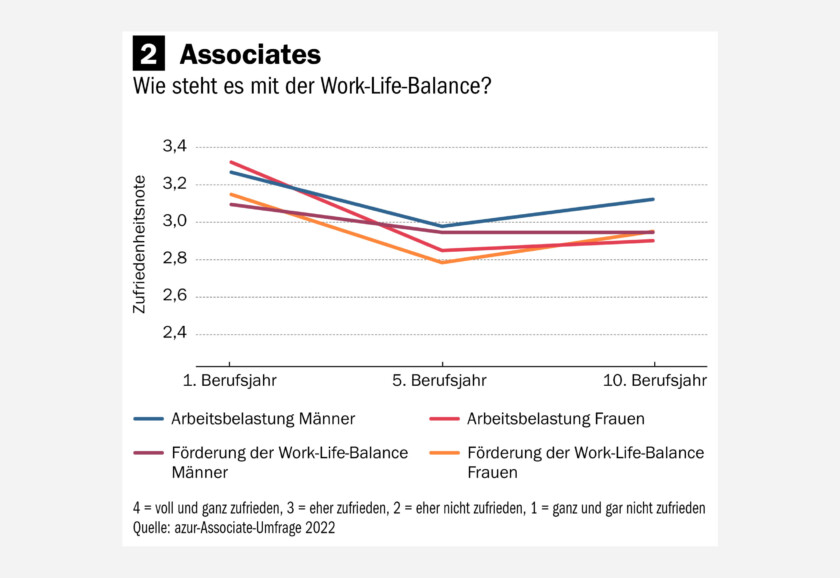 Ein Blick auf die Zufriedenheit der Associates in Abhängigkeit zu den Berufsjahren zeigt, dass die jungen Juristinnen und Juristen zumindest sehr zufrieden und leistungsbereit in den Beruf starten (Grafik 2): Sowohl weibliche als auch männliche Associates geben in den ersten Berufsjahren eine „sehr gute“ Zufriedenheit mit ihrer Work-Life-Balance an. Doch bis zum fünften Berufsjahr kommt die Ernüchterung: Gerade in einer Zeit, in der die Weichen für einen möglichen Aufstieg gestellt werden, sinken die Zufriedenheitswerte. Besonders Frauen vermissen in dieser Phase eine angemessene Förderung der Work-Life-Balance. Und das ist nicht trivial, denn: Gerade zwischen dem fünften und siebten Berufsjahr, das zeigt die Umfrage Jahr für Jahr, befinden sich besonders viele Associates auf dem Sprung.