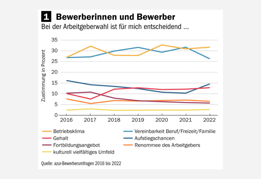 Und das nicht erst seit gestern: Eine Auswertung der Prioritäten, die Bewerbende in den vergangenen Jahren in der azur-Umfrage angegeben haben, zeigt: Weiche Faktoren wie das Betriebsklima rangieren schon lange und mit Abstand auf den vorderen Plätzen (Grafik 1). Durchschnittlich jeder vierte Befragte gibt an, dass für ihn die Vereinbarkeit von Beruf und Privatleben bei der Arbeitgeberwahl entscheidend ist. Das Ausbildungsangebot, an dem viele Arbeitgeber Jahr für Jahr feilen, spielt dagegen nur für maximal zehn Prozent eine entscheidende Rolle.