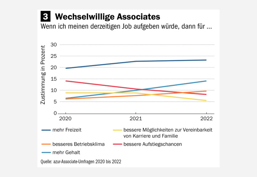 Eine interessante Verschiebung ergibt sich in der Hochphase der Corona-Pandemie, als umfassende Homeoffice-Regelungen auch für Kanzleien Realität wurden. In dieser Zeit haben sich die Prioritäten der Bewerbenden verändert, weil eine bessere Vereinbarkeit von Beruf und Privatleben plötzlich gegeben war. Doch werden die Wünsche der angehenden Juristinnen und Juristen nach einer ausgeglichenen Work-Life-Balance erfüllt? Trotz Homeoffice-Regelungen und diverser Mental Health-Programme wird ja bekanntermaßen nicht weniger gearbeitet: Im Durchschnitt geben die Anwältinnen und Anwälte in Kanzleien in der aktuellen azur-Umfrage, an der sich mehr als 3.500 Associates beteiligt haben, rund 53 Wochenstunden an.