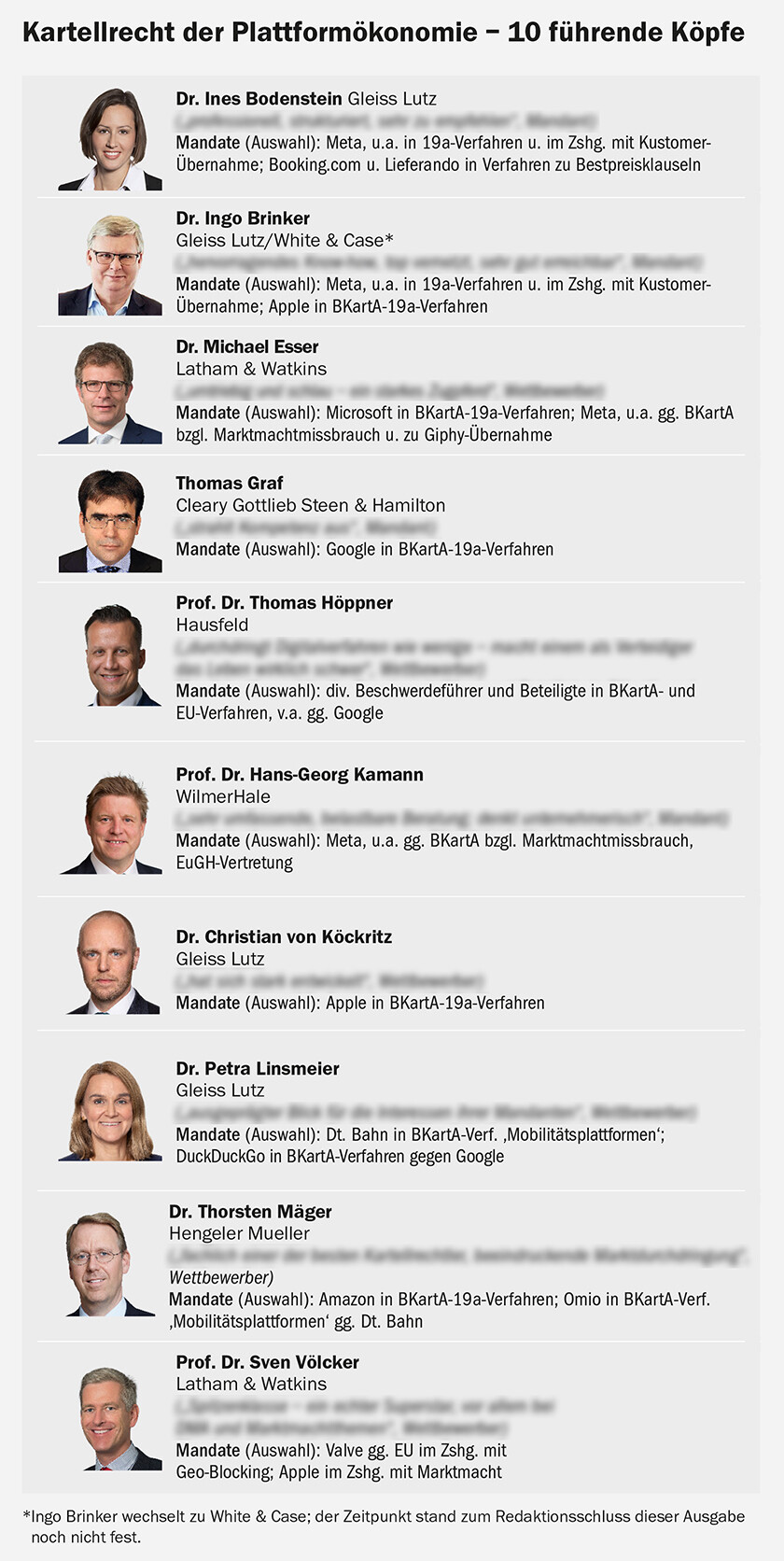 Wie ernst die Unternehmen diese Verfahren nehmen, lässt sich daran ablesen, dass nahezu die gesamte Marktspitze der deutschen Kartellrechtspraxen mit großen Teams im Einsatz ist, manche sogar doppelt: So vertritt Gleiss Lutz etwa Apple und Meta und ist in der Liste der renommiertesten Plattformökonomie-Spezialisten am stärksten vertreten. Hengeler Mueller ist vor allem für Amazon tätig, hat aber auch Google und Microsoft schon im Zusammenhang mit ihrer Marktmacht vor dem Kartellamt vertreten. Latham & Watkins, die Meta in einigen Verfahren gemeinsam mit Gleiss vertritt, ist auch für Microsoft in einem 19a-Verfahren tätig. Google setzt in der Mehrzahl der deutschen Fälle auf Cleary Gottlieb Steen & Hamilton.