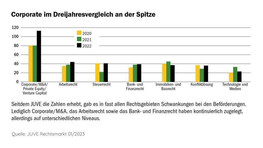 Die wichtigsten Wirtschaftskanzleien lassen sich bei ihren Beförderungen allerdings wenig von den aktuellen Krisen und der wirtschaftlichen Konjunktur leiten. Das zeigt auch unsere Dreijahresübersicht. Bei diesen absoluten Zahlen ragt Corporate mit 113 beförderten Anwältinnen und Anwälten heraus. Dahinter folgen, teils mit Schwankungen, ähnliche Rechtsgebiete wie in den Vorjahren. Auch die Beförderungsquoten im Vergleich zum Vorjahr zeugen von strategischer Stabilität.