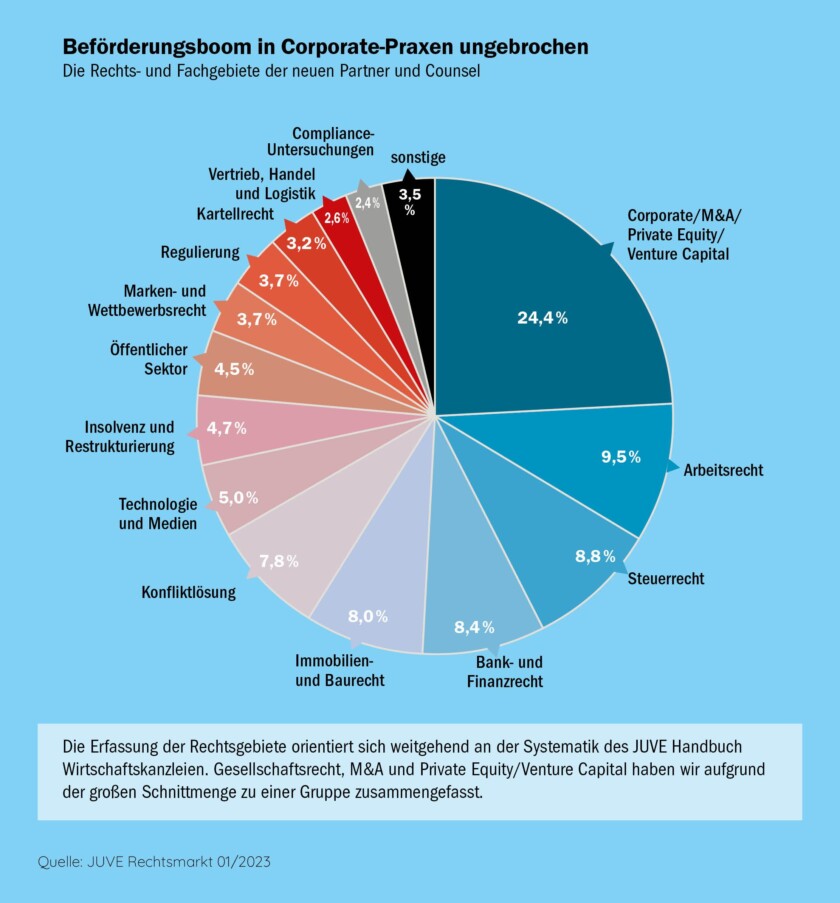 Fast ein Viertel der Beförderungen des Jahres 2022 entfällt auf die hier unter Corporate zusammengefassten Praxen. Nach 21 Prozent der Ernennungen im Vorjahr stieg der Anteil noch einmal an. Mehr neue Partnerinnen, Partner und Counsel gibt es beispielsweise auch im Steuerrecht, das es nach 2021 jetzt mit etwa 9 Prozent wieder unter die vier vorderen Rechtsgebiete schafft.
