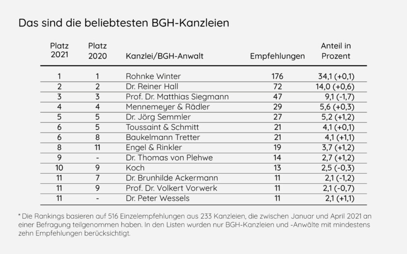 * Die Rankings basieren auf 516 Einzelempfehlungen aus Kanzleien, die zwischen Januar und April 2021 an einer Befragung teilgenommen haben. In den Listen wurden nur BGH-Kanzleien und – Anwälte mit mindestens zehn Empfehlungen berücksichtigt.