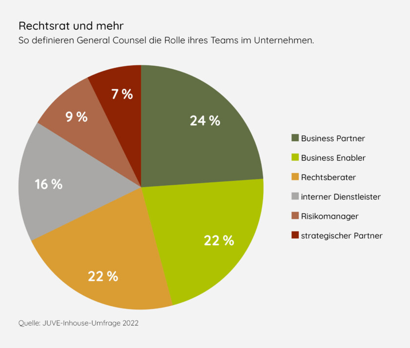 Rund 24 Prozent der Befragten sehen sich als ‚Business Partner‘. Als solche orientiert sich ihre Einstellung zwar weiterhin am klassischen Selbstverständnis der Inhouse-Juristinnen und -Juristen als Rechtsberater. Sie entwickelt sich jedoch weiter. Denn ein ‚Business Partner‘ agiert nach JUVE-Interpretation bereits näher am operativen Geschäft als klassische ‚Rechtsberater‘. Mit der Rolle des Rechtsberaters identifizieren sich in der Umfrage noch rund 22 Prozent der General Counsel.