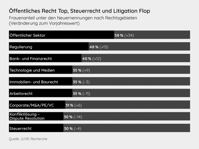 Bei den Rechtsgebieten sticht dieses Jahr das Öffentliche Recht hervor: 58 Prozent aller Partner- und Counsel-Beförderungen in diesem Bereich entfielen auf Frauen. Schlusslichter in dieser Hinsicht sind Corporate, Konfliktlösung und Steuerrecht, die bei den Ernennungen nicht mal auf ein Drittel Frauenanteil kommen.