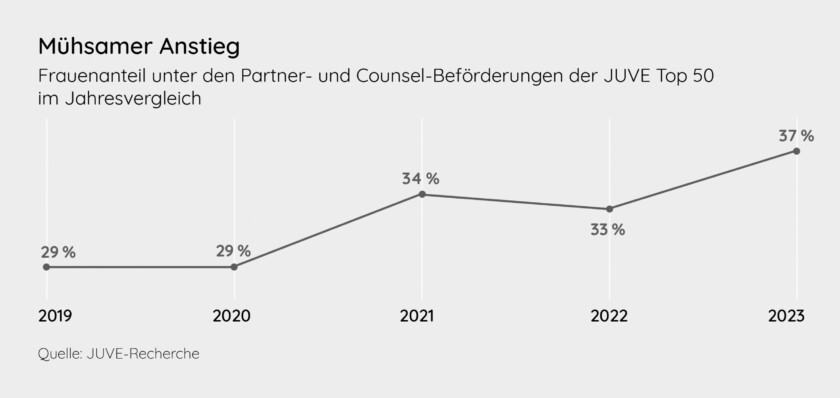 Wenn in einem Jahr 37 Prozent der beförderten Personen weiblich sind, bedeutet das zwar für viele Kanzleien, dass die Partnerriege insgesamt weiblicher wird – schlicht, weil der Status quo noch weit unter diesen 37 Prozent liegt. Allerdings müsste, um langfristig ein annähernd ausgewogenes Geschlechterverhältnis zu erreichen, der Frauenanteil an den Ernennungen bei dieser Ausgangslage mehrere Jahre deutlich über 50 Prozent liegen.