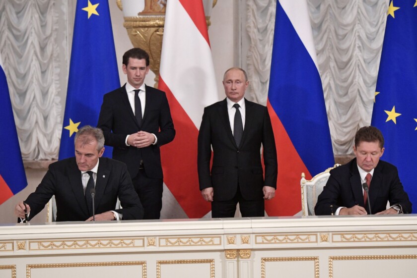 Der frühere Vorstandsvorsitzende der OMV Rainer Seele (li.) und Gazprom-Chef Alexej Miller bei einer Vertragsunterzeichnung im Oktober 2018 in St. Petersburg. Foto: Alexei Nikolsky / picture alliance / dpa