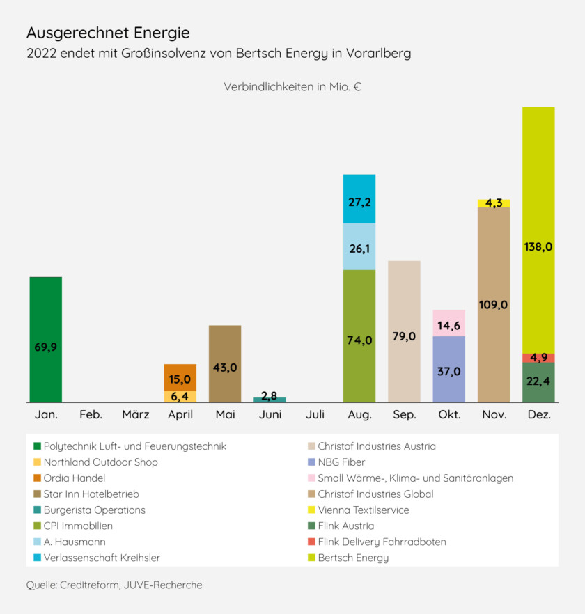 Während es in der ersten Jahreshälfte noch ruhig blieb, häuften sich ab August größere Insolvenzen. In der Übersicht Ausgerechnet Energie nicht erfasst ist allerdings die CPI-Gruppe, die aus verschiedenen insolventen Gesellschaften besteht und deren kumulierte Passiva sich auf rund 290 Millionen Euro beziffern.