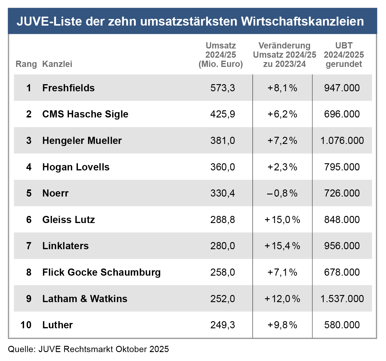 Mehr über die Personal- und Finanzkennzahlen der 100 größten Wirtschaftskanzleien finden Sie in der aktuellen Ausgabe des JUVE Rechtsmarkt (10/25) und online unter mi.juve.de.